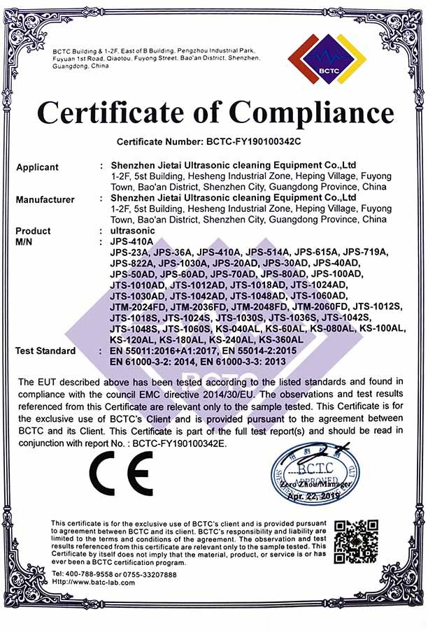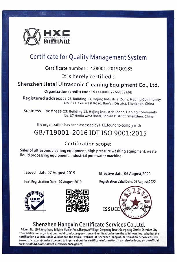? ? ? 公司全面實(shí)行嚴(yán)格的ISO9001:2008質(zhì)量體系管理,以創(chuàng)新著稱而躋身行業(yè)前列,所開發(fā)生產(chǎn)的各種超聲波清洗設(shè)備,先后通過CE、FCC、ROHS、等認(rèn)證,產(chǎn)品專利達(dá)50多項(xiàng),技術(shù)達(dá)國際同類產(chǎn)品先進(jìn)水平。